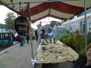Gezellige jaarmarkt rond en om de stadsgracht van Sloten en het historisch festival Sloten van de Vrienden van de Krukas met demonstratie smeden naast het Slettemer gat .